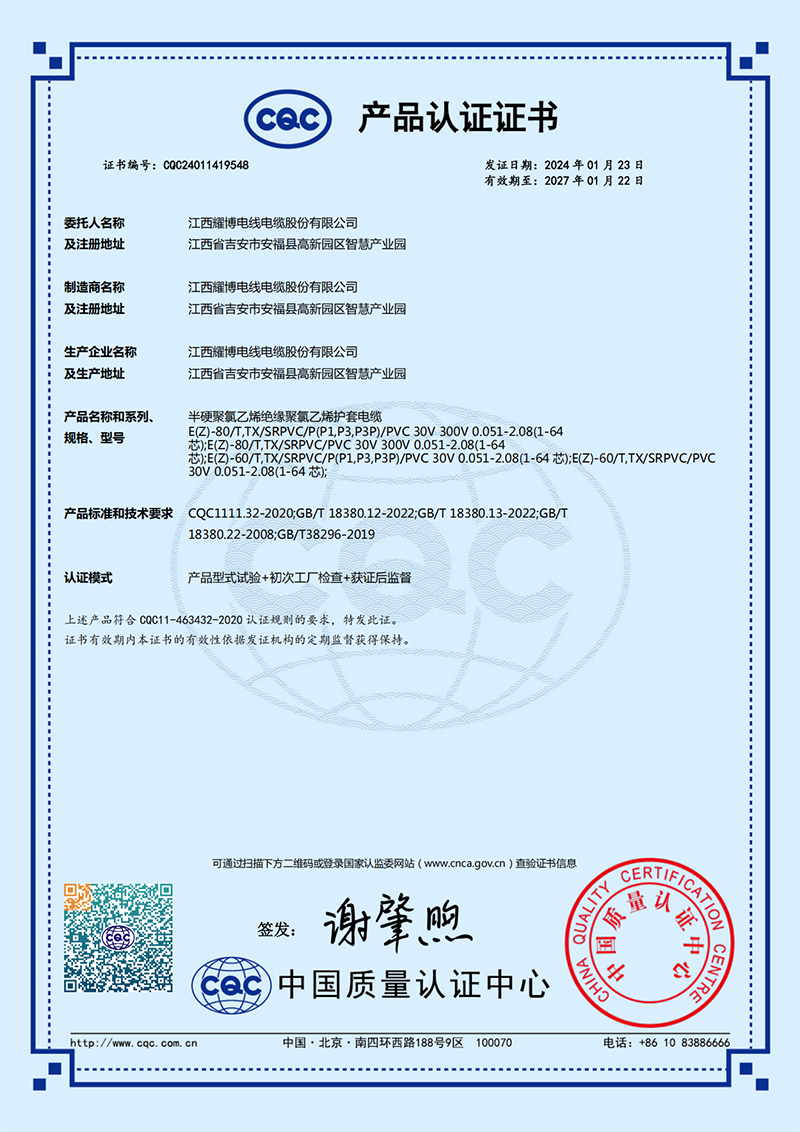 半硬聚氯乙烯绝缘聚氯乙烯护套电缆CQC证书